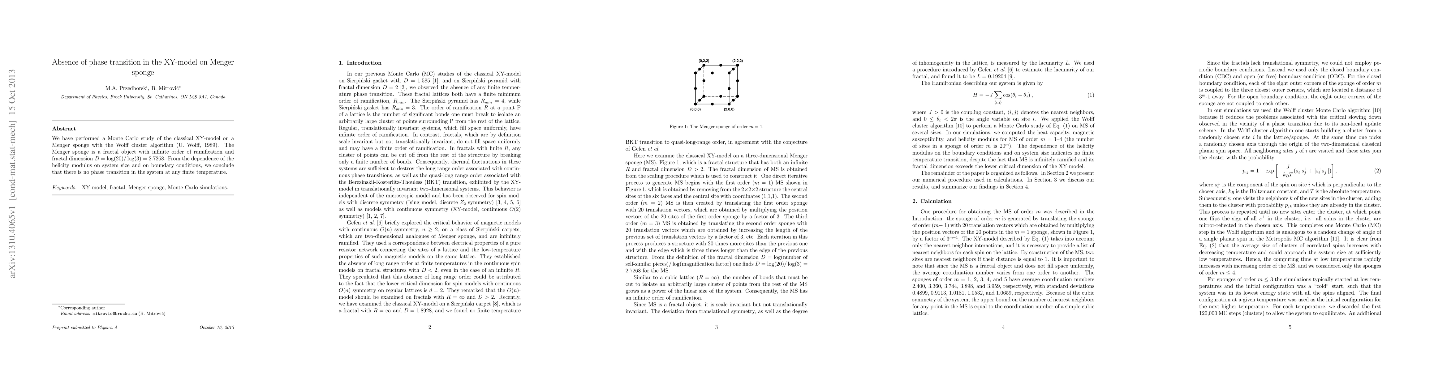 The study used Monte Carlo simulations to test the XY-model on the Menger sponge, concluding that the system remains stable at all finite temperatures.