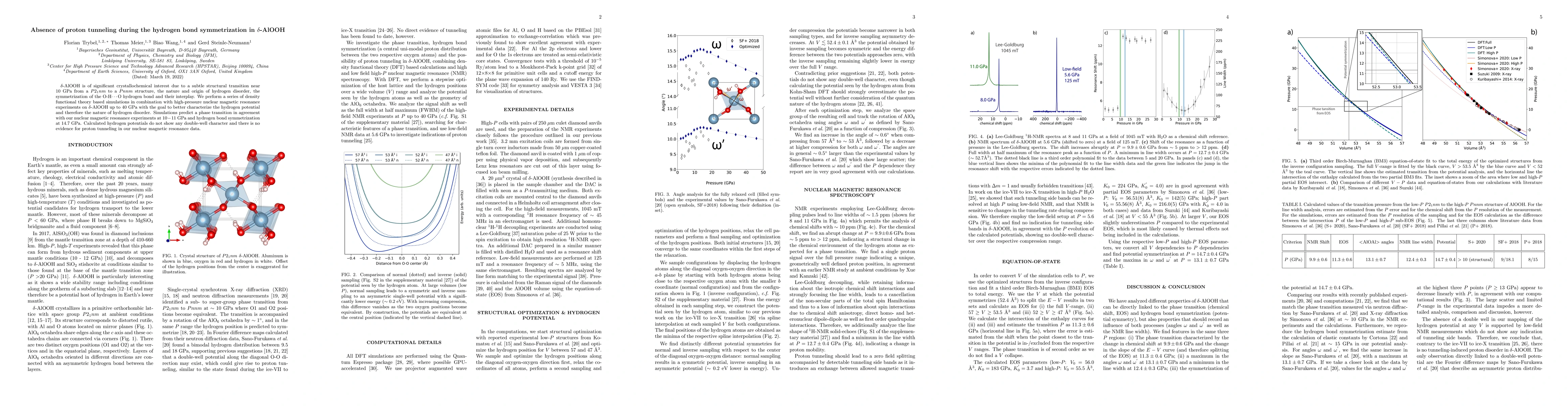 This study investigates the structural transition and hydrogen bond symmetrization in $\delta$-AlOOH using density functional theory simulations and high-pressure NMR experiments. Results show a phase transition at $10-11$ GPa and hydrogen bond symmetrization at $14.7$ GPa, but no proton tunneling is observed.
