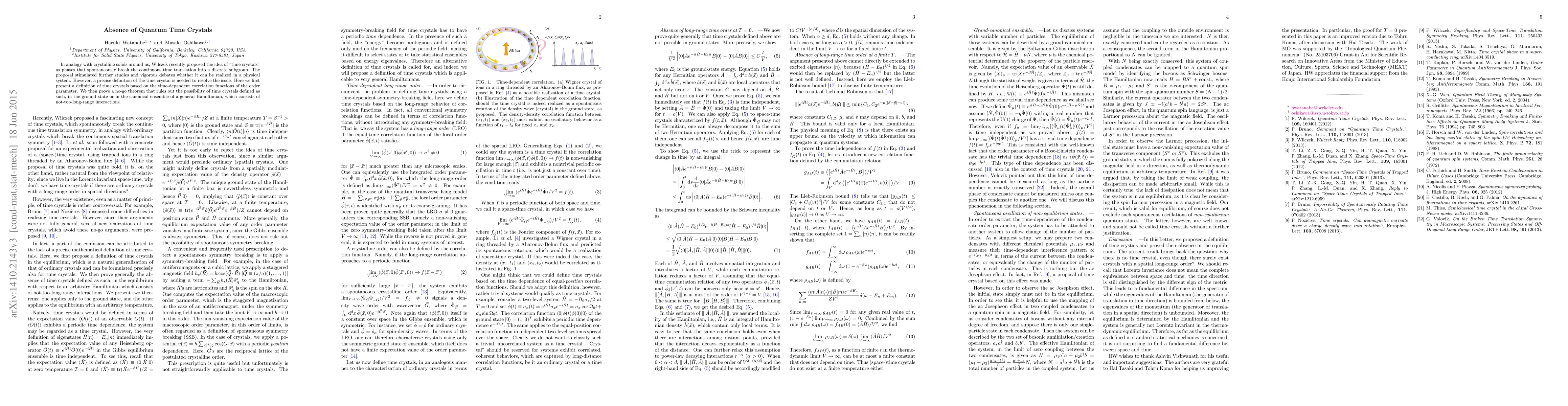 In analogy with crystalline solids around us, Wilczek recently proposed the idea of "time crystals" as phases that spontaneously break the continuous time translation into a discrete subgroup. The proposal stimulated further studies and vigorous debates whether it can be realized in a physical system. However, a precise definition of the time crystal is needed to resolve the issue. Here we first present a definition of time crystals based on the time-dependent correlation functions of the order parameter. We then prove a no-go theorem that rules out the possibility of time crystals defined as such, in the ground state or in the canonical ensemble of a general Hamiltonian, which consists of not-too-long-range interactions.