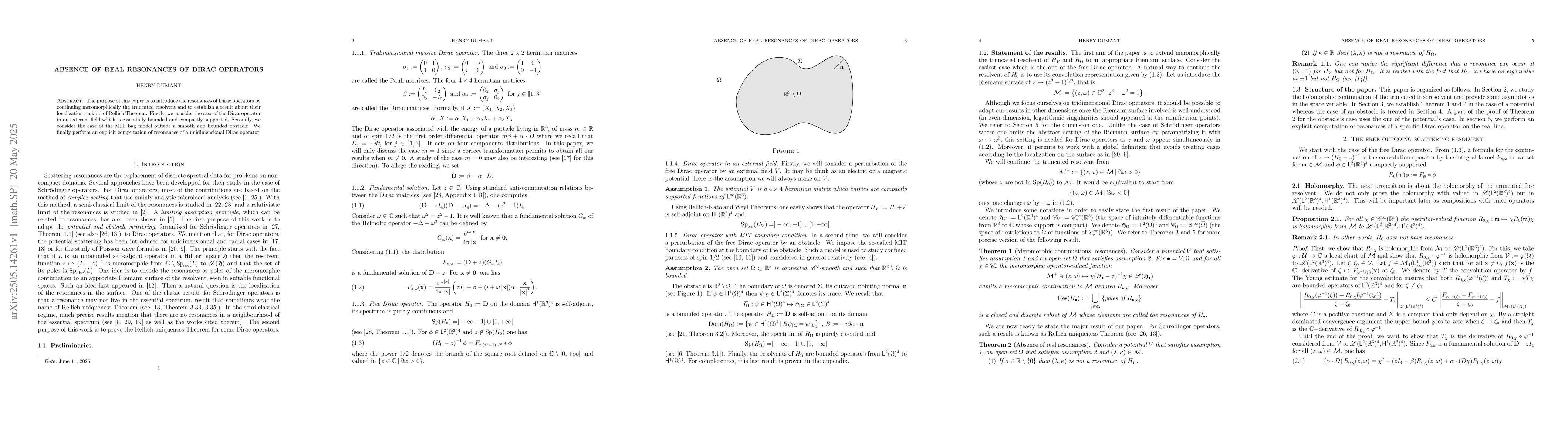 The work presents a unique combination of theoretical analysis and explicit computations, providing new insights into the resonance properties of Dirac operators under various conditions.