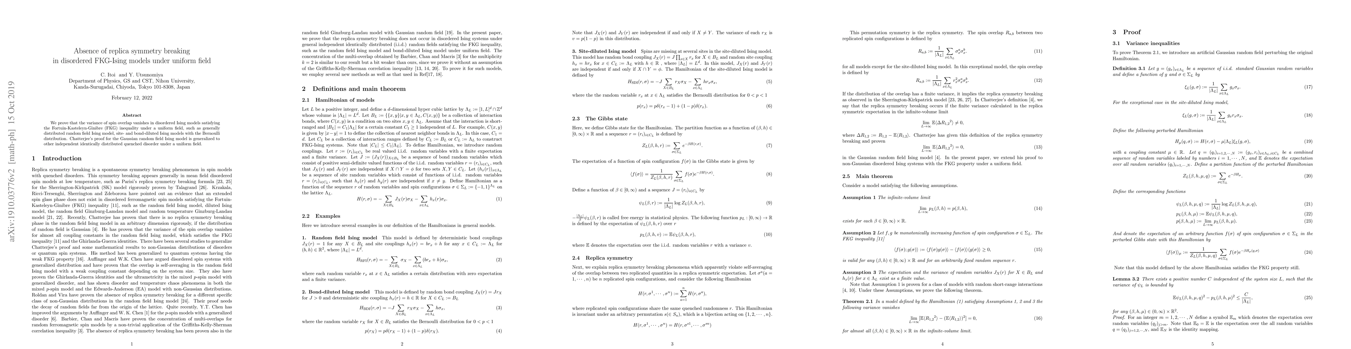 The study proves that in disordered FKG-Ising models under a uniform field, there is no replica symmetry breaking, meaning the variance of spin overlap remains zero. This finding has implications for understanding phase transitions in complex systems with disorder.