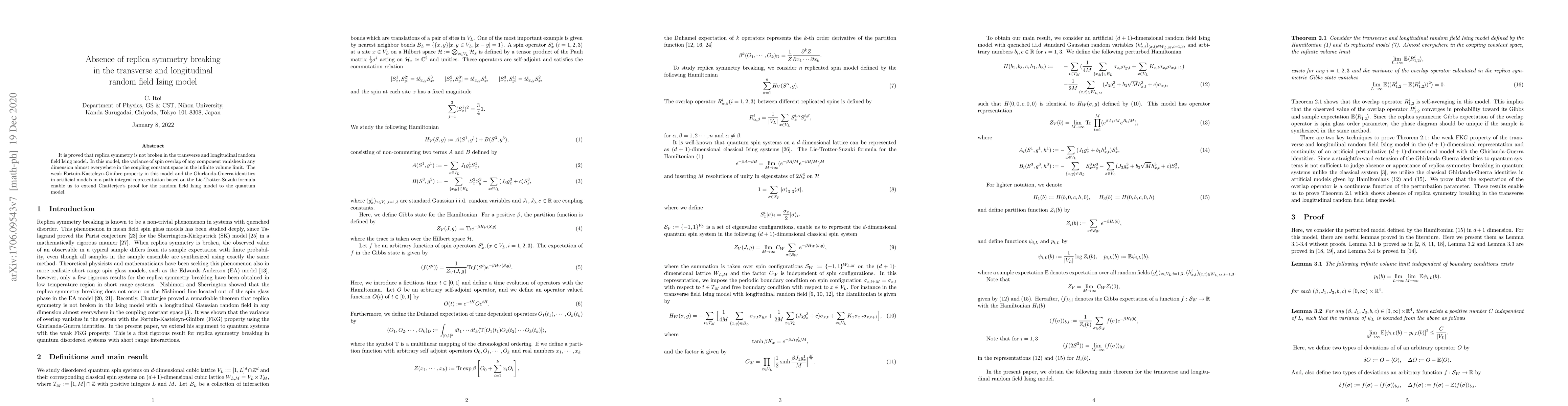 It is proved that replica symmetry is not broken in the transverse and longitudinal random field Ising model. In this model, the variance of spin overlap of any component vanishes in any dimension almost everywhere in the coupling constant space in the infinite volume limit. The weak Fortuin-Kasteleyn-Ginibre property in this model and the Ghirlanda-Guerra identities in artificial models in a path integral representation based on the Lie-Trotter-Suzuki formula enable us to extend Chatterjee's proof for the random field Ising model to the quantum model.