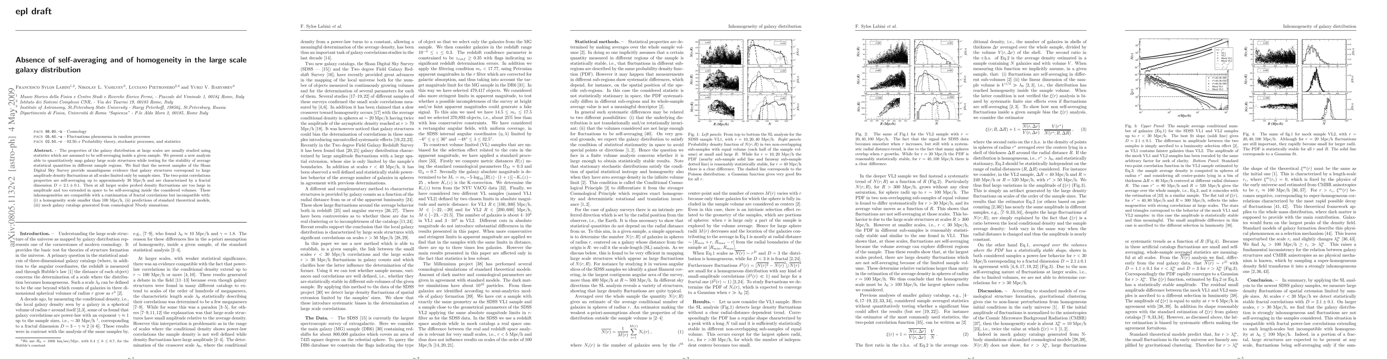 This paper reveals that large-scale galaxy distributions exhibit significant inhomogeneities beyond 30 Mpc/h, defying self-averaging properties and homogeneity, and contradicting predictions from standard cosmological models and simulations. The fractal dimension of galaxy correlations is found to be D=2.1 ± 0.1 up to 30 Mpc/h.
