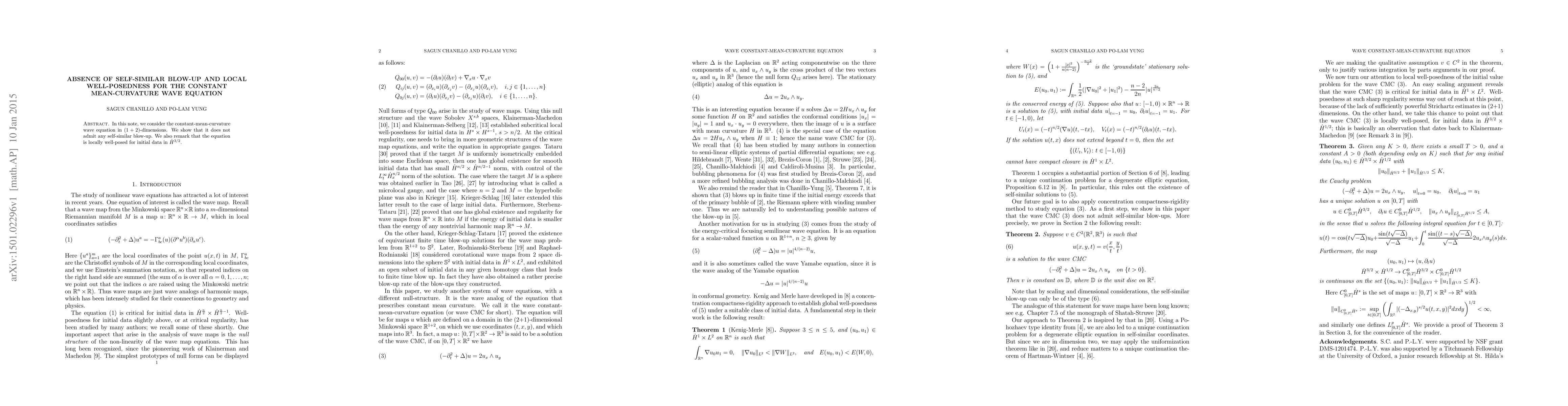 A research paper investigates the constant-mean-curvature wave equation in 1+2 dimensions, finding it does not admit self-similar blow-up and is locally well-posed for initial data in H^(3/2).
