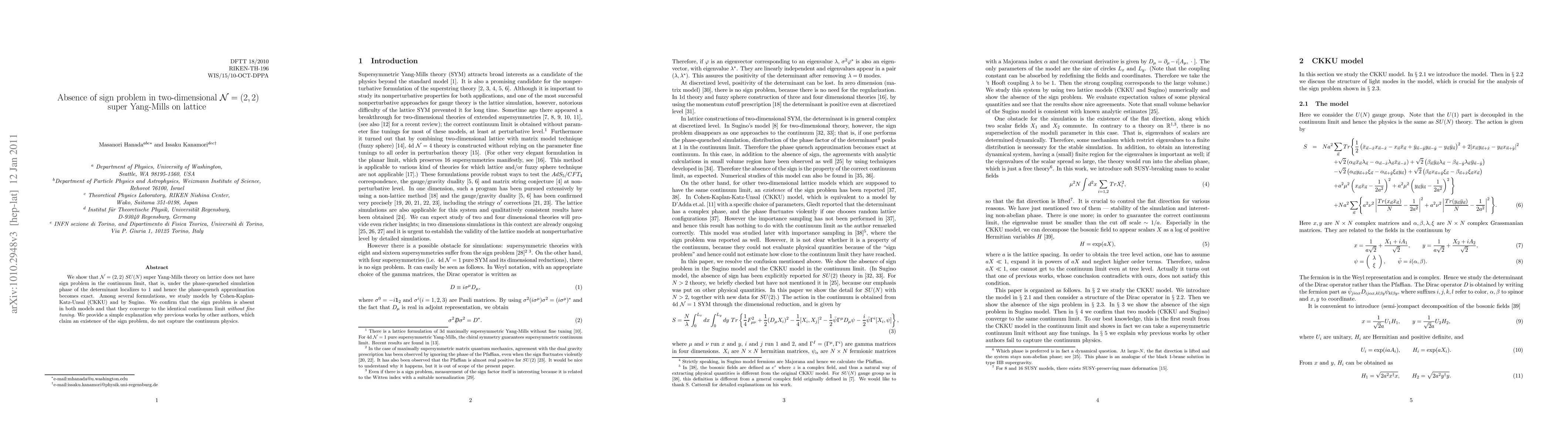 This research demonstrates that two-dimensional N=(2,2) super Yang-Mills theory on a lattice does not have a sign problem in its continuum limit. The study confirms this absence in both the Cohen-Kaplan-Katz-Unsal (CKKU) and Sugino models, which converge to the same limit without fine-tuning. It also explains why previous works claiming a sign problem may not represent continuum physics.