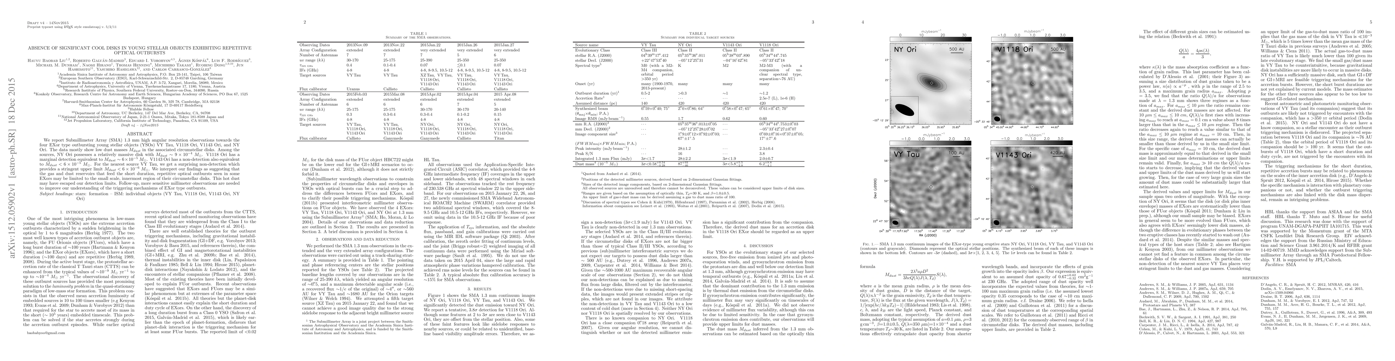 This study reveals low dust masses in the circumstellar disks of four EXor type young stellar objects using SMA observations, suggesting limited gas and dust reservoirs for their repetitive optical outbursts. Notably, VY Tau shows a stringent upper limit for dust mass, indicating that the outbursts may be fueled by hot dust in the innermost disk regions.