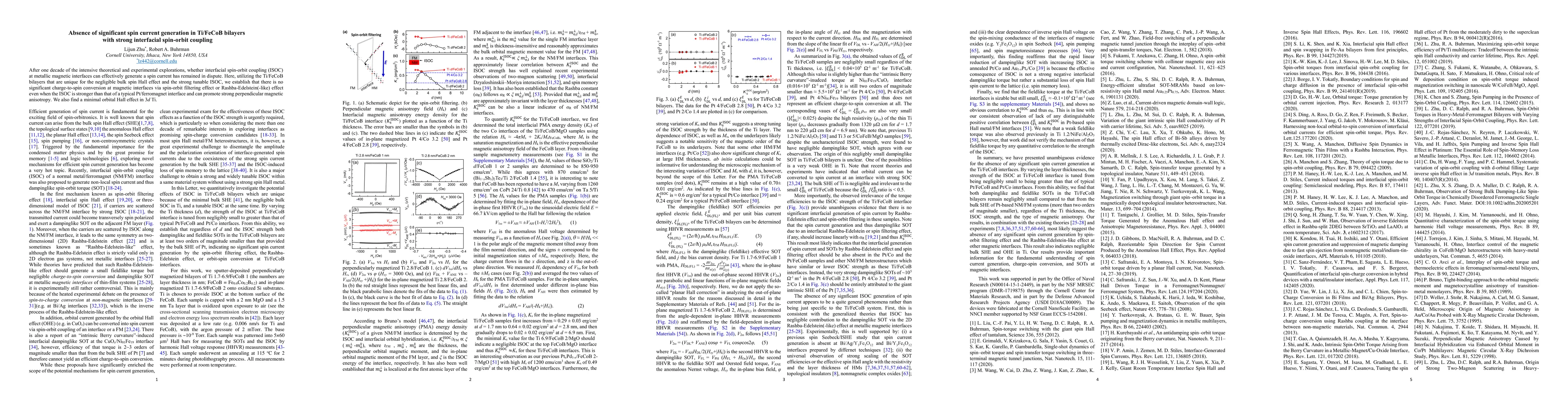 Summary: Despite strong interfacial spin-orbit coupling in Ti/FeCoB bilayers, no significant spin current generation is observed, challenging the effectiveness of ISOC for charge-to-spin conversion. Additionally, minimal orbital Hall effect is detected in 3d Ti.