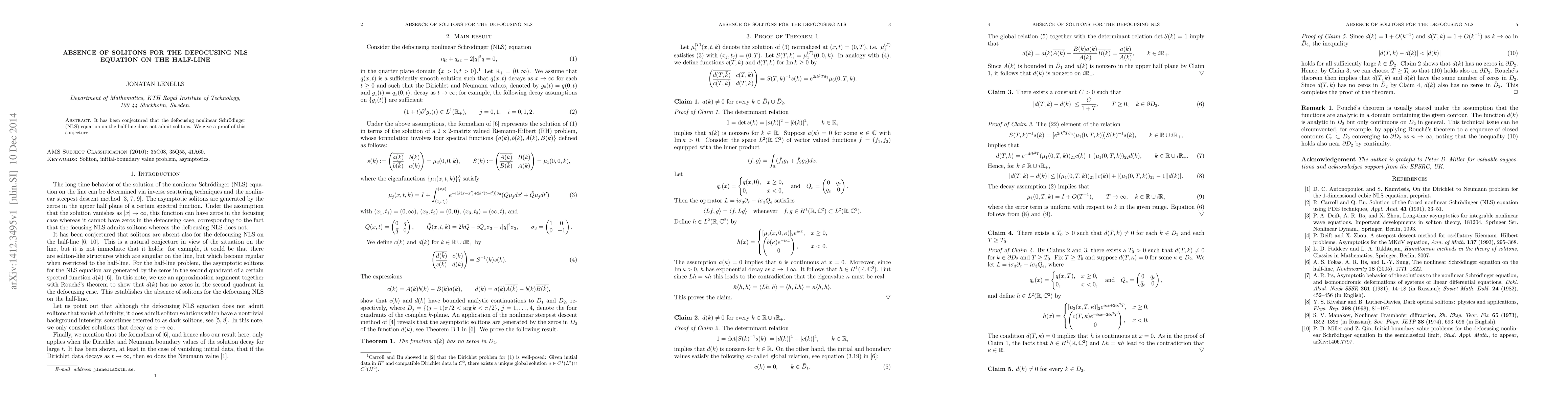 Summary: This paper proves the conjecture that the defocusing nonlinear Schrödinger (NLS) equation on the half-line does not support soliton solutions. The authors provide a rigorous mathematical demonstration of this absence.