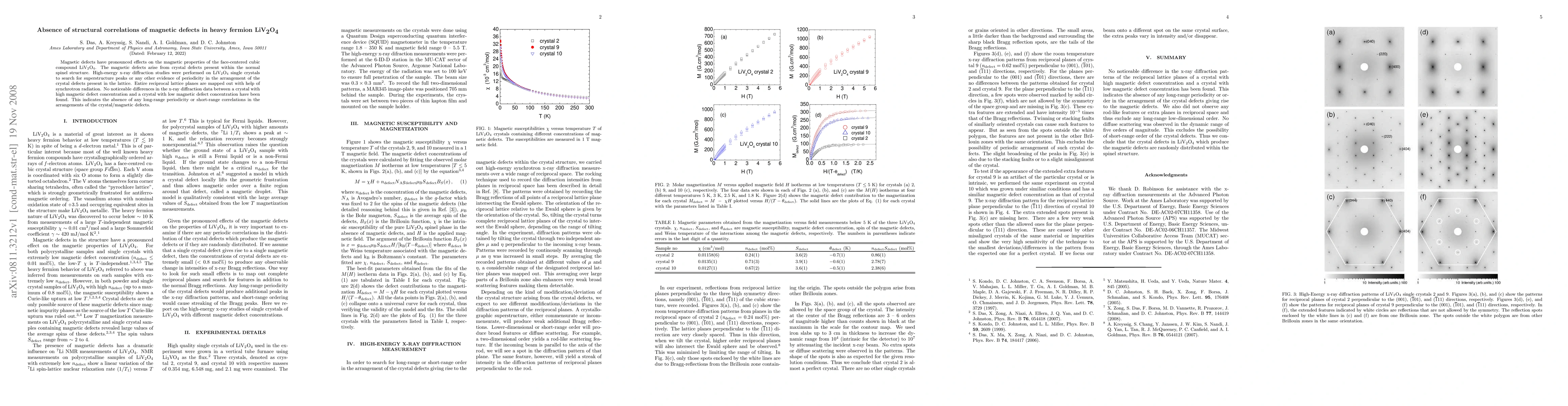 Magnetic defects have pronounced effects on the magnetic properties of the face-centered cubic compound LiV2O4. The magnetic defects arise from crystal defects present within the normal spinel structure. High-energy x-ray diffraction studies were performed on LiV2O4 single crystals to search for superstructure peaks or any other evidence of periodicity in the arrangement of the crystal defects present in the lattice. Entire reciprocal lattice planes are mapped out with help of synchrotron radiation. No noticeable differences in the x-ray diffraction data between a crystal with high magnetic defect concentration and a crystal with low magnetic defect concentration have been found. This indicates the absence of any long-range periodicity or short-range correlations in the arrangements of the crystal/magnetic defects.