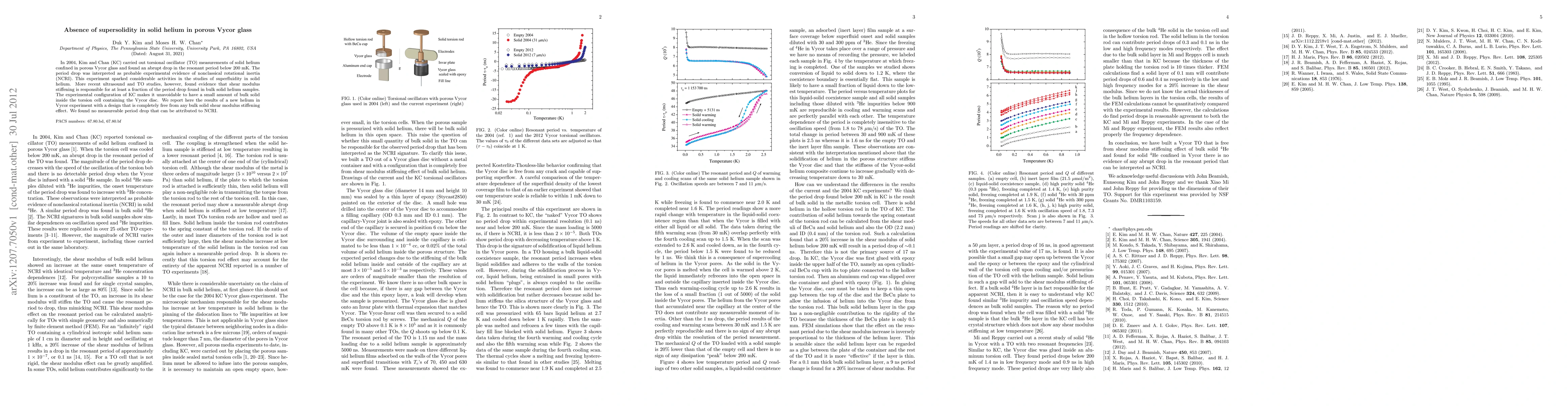This paper reports new torsional oscillator measurements of solid helium in porous Vycor glass, designed to exclude bulk solid shear modulus stiffening effects. Contrary to previous findings, no evidence of nonclassical rotational inertia was detected, suggesting supersolidity is absent in this system.