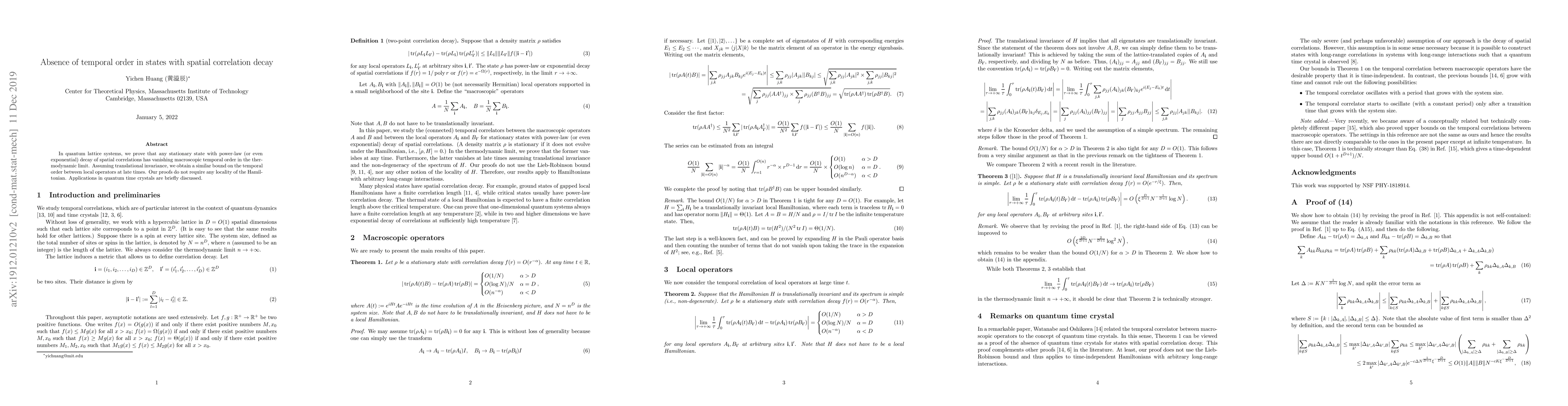 In quantum lattice systems, we prove that any stationary state with power-law (or even exponential) decay of spatial correlations has vanishing macroscopic temporal order in the thermodynamic limit. Assuming translational invariance, we obtain a similar bound on the temporal order between local operators at late times. Our proofs do not require any locality of the Hamiltonian. Applications in quantum time crystals are briefly discussed.