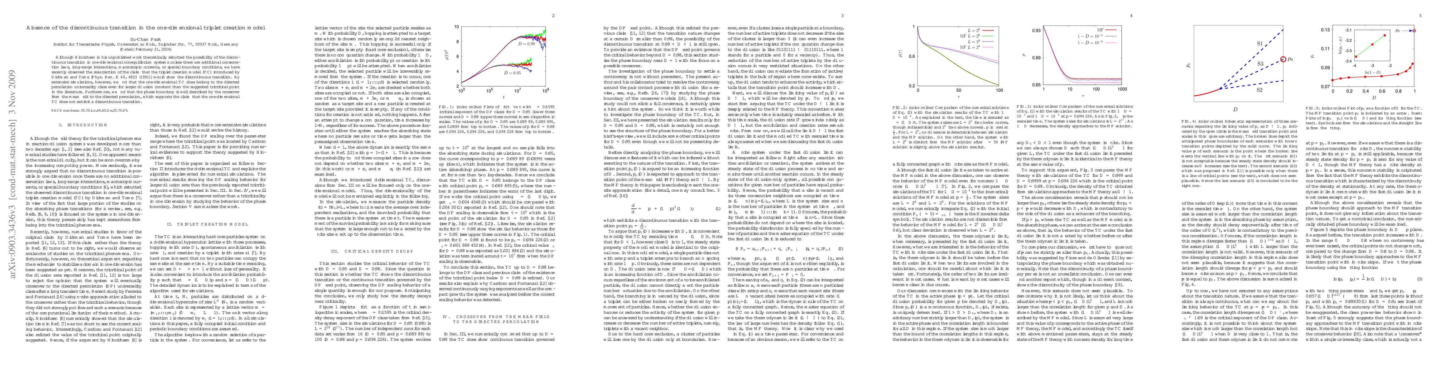 This paper refutes the claim of a discontinuous transition in the one-dimensional triplet creation model, demonstrating through extensive simulations that the model belongs to the directed percolation universality class, thus supporting the theoretical rebuttal by Hinrichsen. The phase boundary is shown to follow a crossover from mean field to directed percolation, confirming the absence of a discontinuous transition.