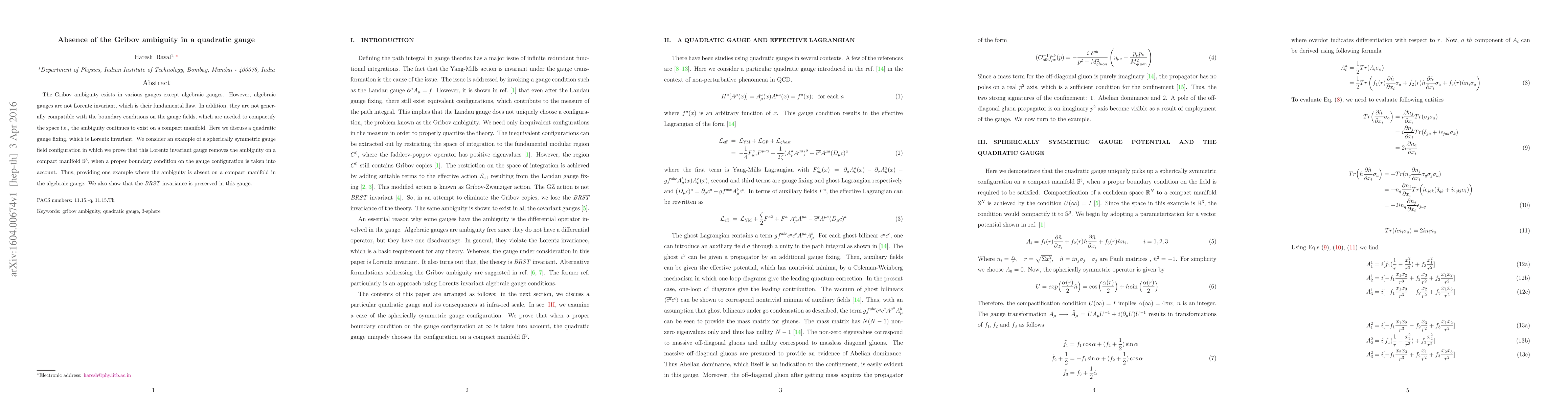 This paper demonstrates that a quadratic gauge fixing, which is Lorentz invariant, eliminates the Gribov ambiguity for a spherically symmetric gauge field configuration on the compact manifold $\mathbb{S}^3$, while preserving BRST invariance. This marks a rare instance where the Gribov ambiguity is absent in an algebraic gauge on a compact space.