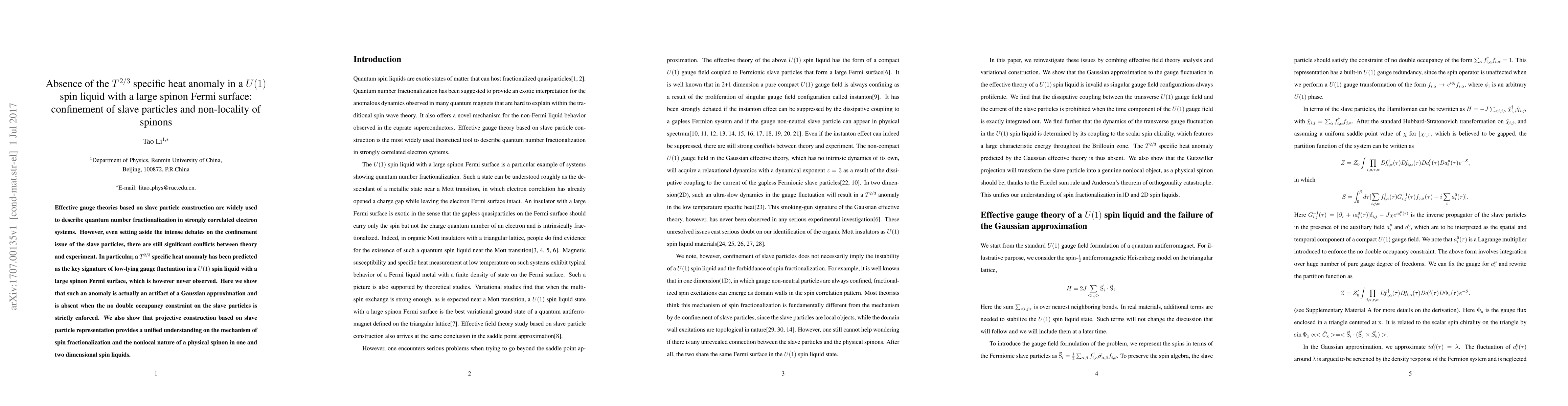 This paper demonstrates that the predicted $T^{2/3}$ specific heat anomaly in $U(1)$ spin liquids with large spinon Fermi surfaces is an artifact of Gaussian approximation, not observed experimentally. It argues that strict enforcement of no double occupancy constraint on slave particles resolves this anomaly and provides a unified understanding of spin fractionalization and the nonlocal nature of spinons.