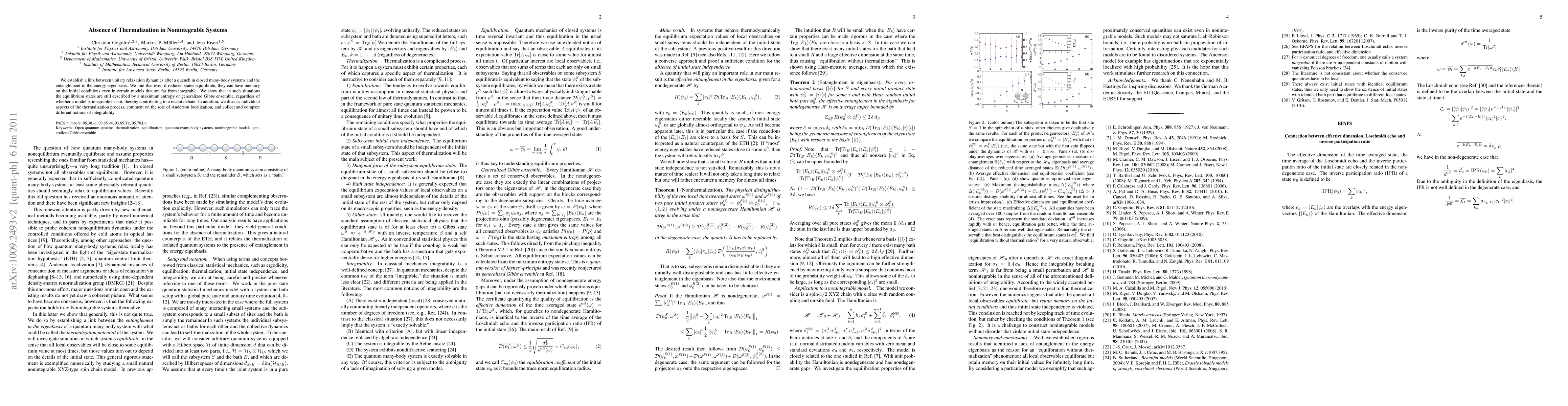 Researchers found that even in non-integrable systems, reduced states can still retain memory of initial conditions, leading to equilibrium states described by a maximum entropy ensemble. This challenges the idea that integrability is necessary for thermalization.