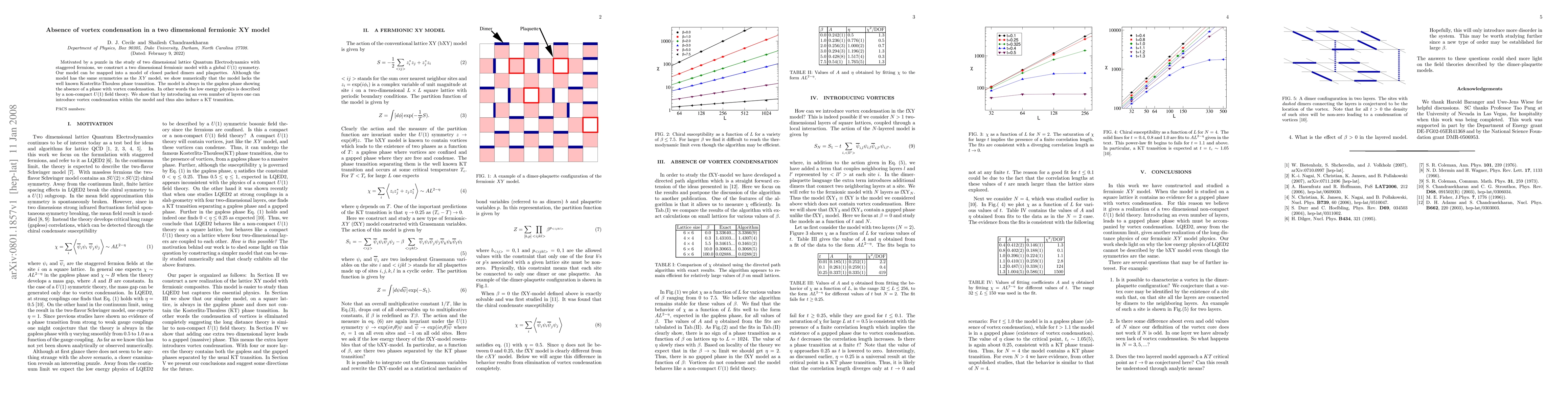 This research constructs a two-dimensional fermionic model with U(1) symmetry, which, despite sharing symmetries with the XY model, lacks vortex condensation and the Kosterlitz-Thouless phase transition, remaining in a gapless phase. Introducing an even number of layers induces vortex condensation and a KT transition.