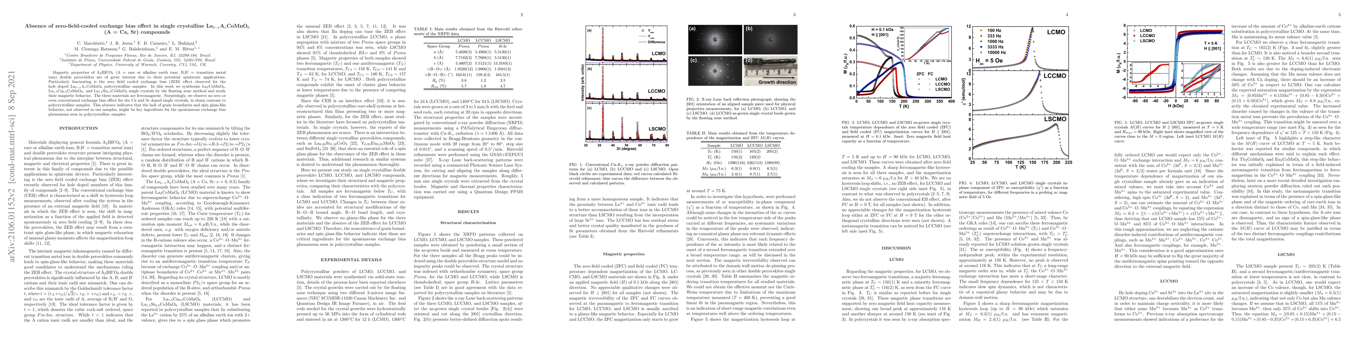 This study investigates the magnetic properties of single crystalline La2-xAxCoMnO6 (A = Ca, Sr) compounds, revealing no zero-field-cooled exchange bias effect despite their ferromagnetic nature. The absence of this effect in single crystals contrasts with observations in polycrystalline samples, suggesting grain boundaries and spin glass behavior are crucial for the exchange bias phenomena.