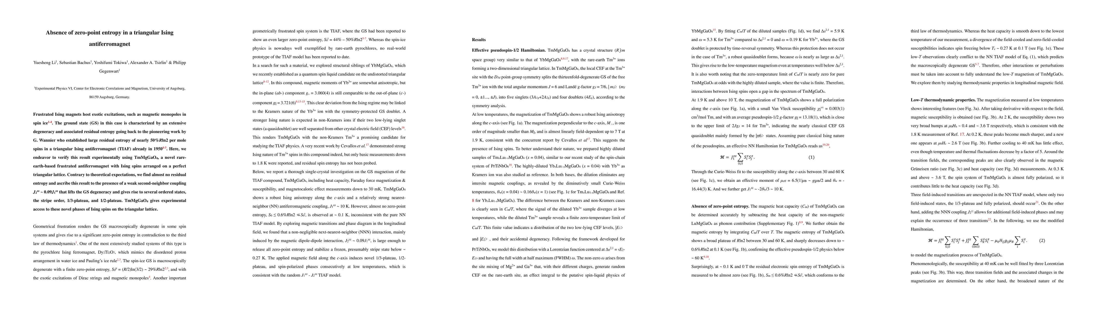 This study experimentally investigates TmMgGaO4, a triangular Ising antiferromagnet, finding almost no residual entropy contrary to theoretical predictions of significant residual entropy due to GS degeneracy. The absence is attributed to a weak second-neighbor coupling that lifts the GS degeneracy, leading to ordered states like stripe order.