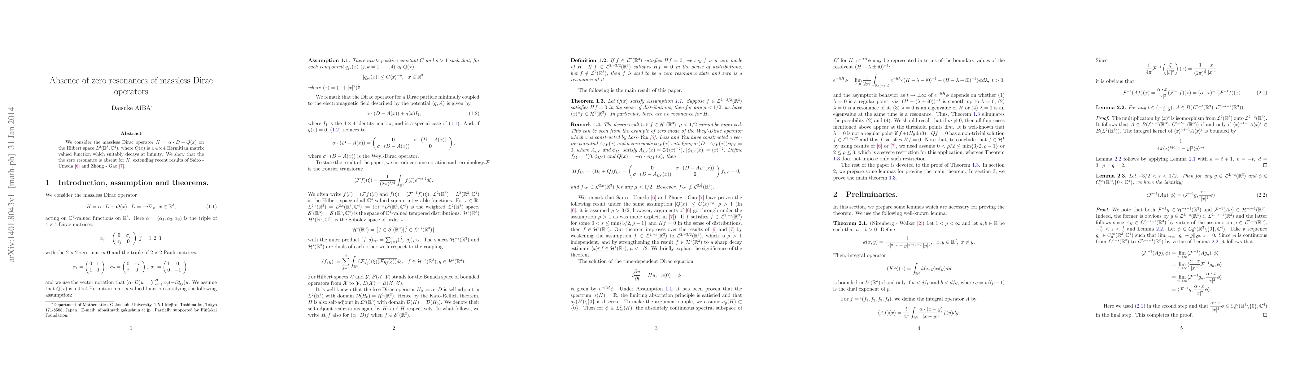 We consider the massless Dirac operator $H=\alpha \cdot D+Q(x)$ on the Hilbert space $L^{2}(\mathbb{R}^{3},\mathbb{C}^{4})$, where $Q(x)$ is a $4\times4$ Hermitian matrix valued function which suitably decays at infinity. We show that the the zero resonance is absent for $H$, extending recent results of Sait\={o}-Umeda and Zhong-Gao.