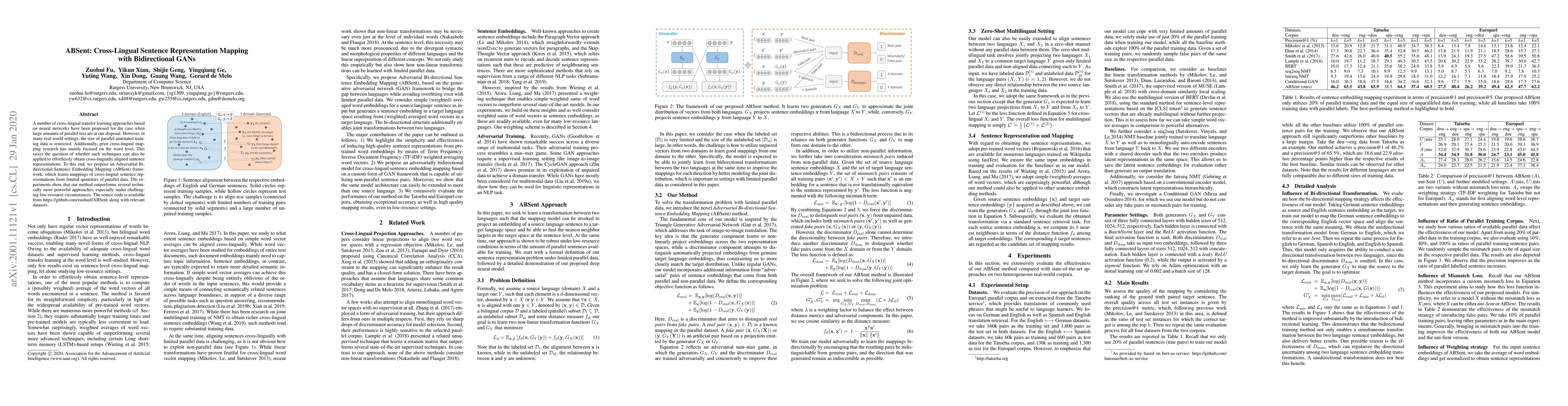 The ABSent framework proposes a novel adversarial bidirectional GAN approach to learn cross-lingual sentence representation mappings from limited parallel data, addressing the gap in existing word-level cross-lingual transfer learning techniques. This method aims to enable effortless alignment of sentence representations across languages with scarce annotated training resources.