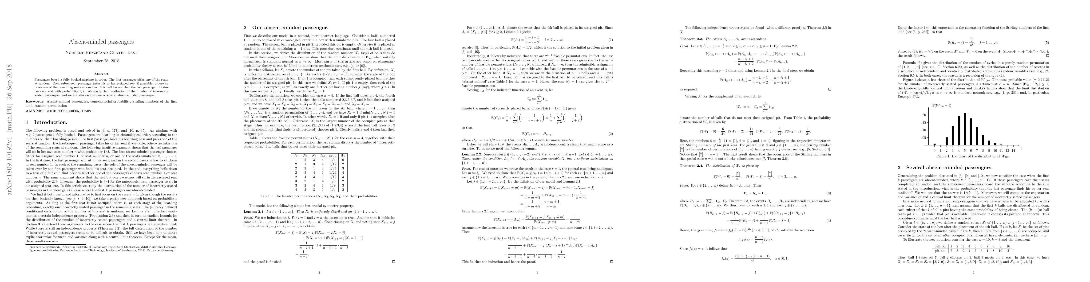 Passengers board a fully booked airplane in order. The first passenger picks one of the seats at random. Each subsequent passenger takes his or her assigned seat if available, otherwise takes one of the remaining seats at random. It is well known that the last passenger obtains her own seat with probability $1/2$. We study the distribution of the number of incorrectly seated passengers, and we also discuss the case of several absent-minded passengers.