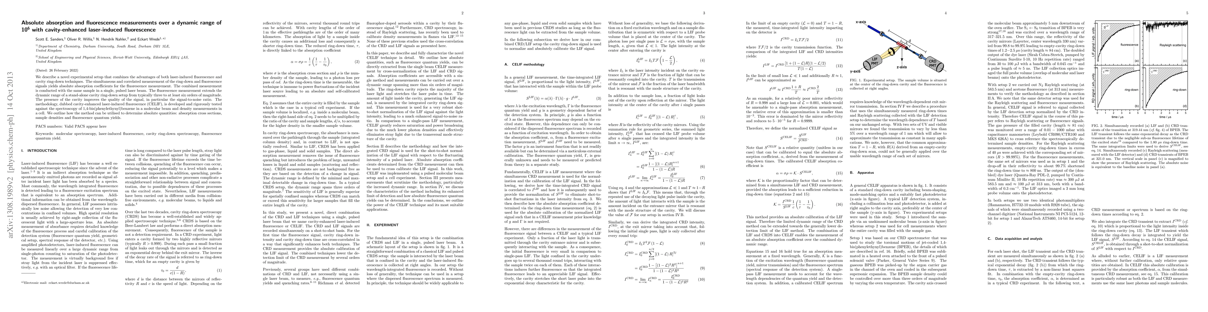 We describe a novel experimental setup that combines the advantages of both laser-induced fluorescence and cavity ring-down techniques. The simultaneous and correlated measurement of the ring-down and fluorescence signals yields absolute absorption coefficients for the fluorescence measurement. The combined measurement is conducted with the same sample in a single, pulsed laser beam. The fluorescence measurement extends the dynamic range of a stand-alone cavity ring-down setup from typically three to at least six orders of magnitude. The presence of the cavity improves the quality of the signal, in particular the signal-to-noise ratio. The methodology, dubbed cavity-enhanced laser-induced fluorescence (CELIF), is developed and rigorously tested against the spectroscopy of 1,4-bis(phenylethynyl)benzene in a molecular beam and density measurements in a cell. We outline how the method can be utilised to determine absolute quantities: absorption cross sections, sample densities and fluorescence quantum yields.