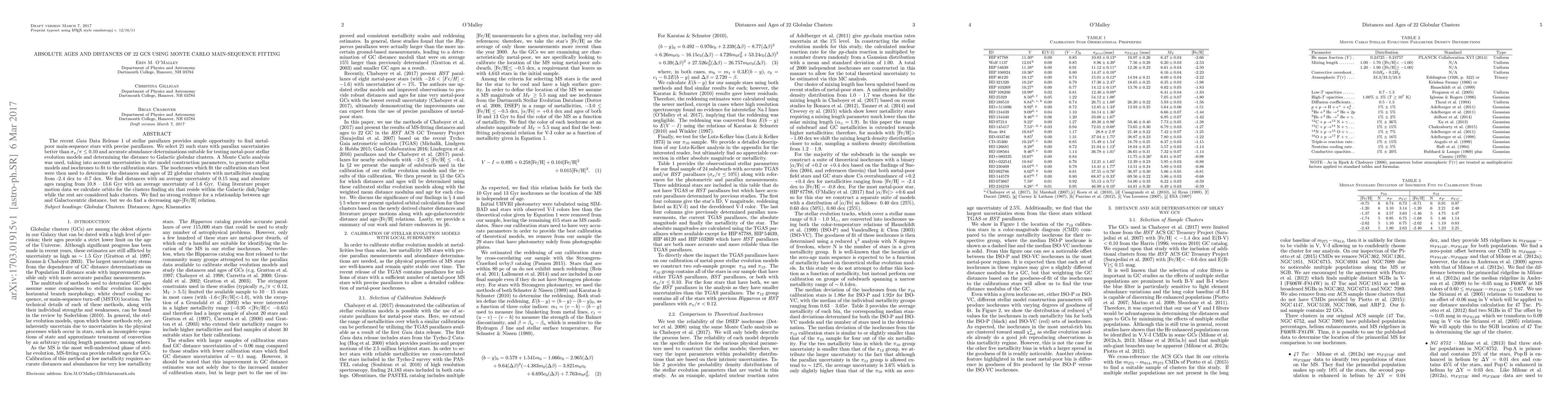 This paper uses Gaia Data Release 1 to determine precise distances and ages for 22 globular clusters (GCs) via Monte Carlo main-sequence fitting, finding average distances with 0.15 mag uncertainty and ages ranging from 10.8 to 13.6 Gyr with 1.6 Gyr uncertainty, revealing a decreasing age-metallicity trend but no strong age-distance correlation.