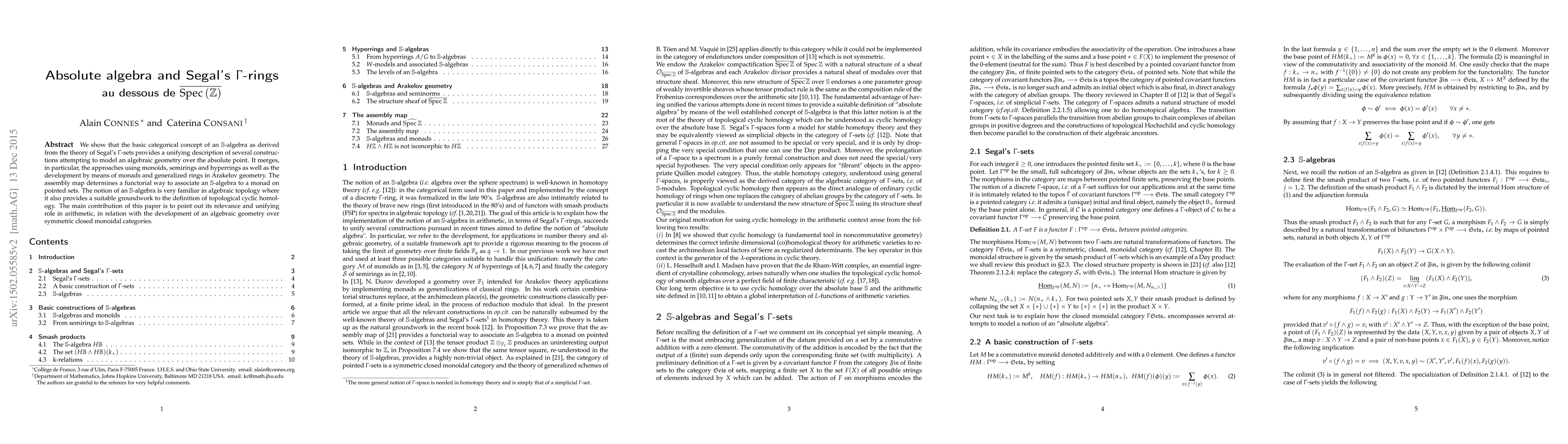 We show that the basic categorical concept of an S-algebra as derived from the theory of Segal's Gamma-sets provides a unifying description of several constructions attempting to model an algebraic geometry over the absolute point. It merges, in particular, the approaches using monoids, semirings and hyperrings as well as the development by means of monads and generalized rings in Arakelov geometry. The assembly map determines a functorial way to associate an S-algebra to a monad on pointed sets. The notion of an S-algebra is very familiar in algebraic topology where it also provides a suitable groundwork to the definition of topological cyclic homology. The main contribution of this paper is to point out its relevance and unifying role in arithmetic, in relation with the development of an algebraic geometry over symmetric closed monoidal categories.