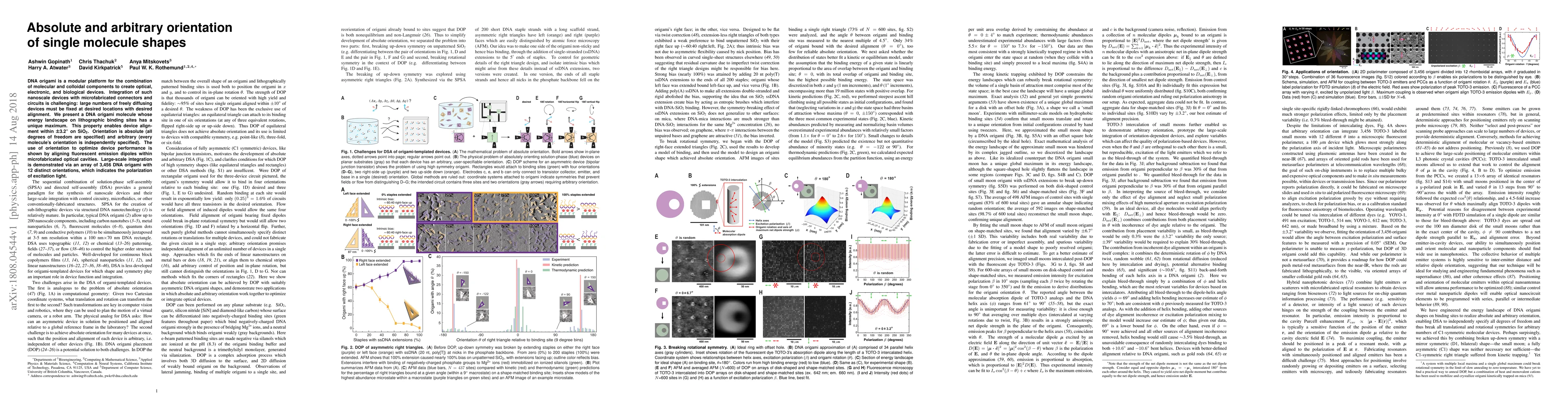 DNA origami is a modular platform for the combination of molecular and colloidal components to create optical, electronic, and biological devices. Integration of such nanoscale devices with microfabricated connectors and circuits is challenging: large numbers of freely diffusing devices must be fixed at desired locations with desired alignment. We present a DNA origami molecule whose energy landscape on lithographic binding sites has a unique maximum. This property enables device alignment within 3.2$^{\circ}$ on SiO$_2$. Orientation is absolute (all degrees of freedom are specified) and arbitrary (every molecule's orientation is independently specified). The use of orientation to optimize device performance is shown by aligning fluorescent emission dipoles within microfabricated optical cavities. Large-scale integration is demonstrated via an array of 3,456 DNA origami with 12 distinct orientations, which indicates the polarization of excitation light.