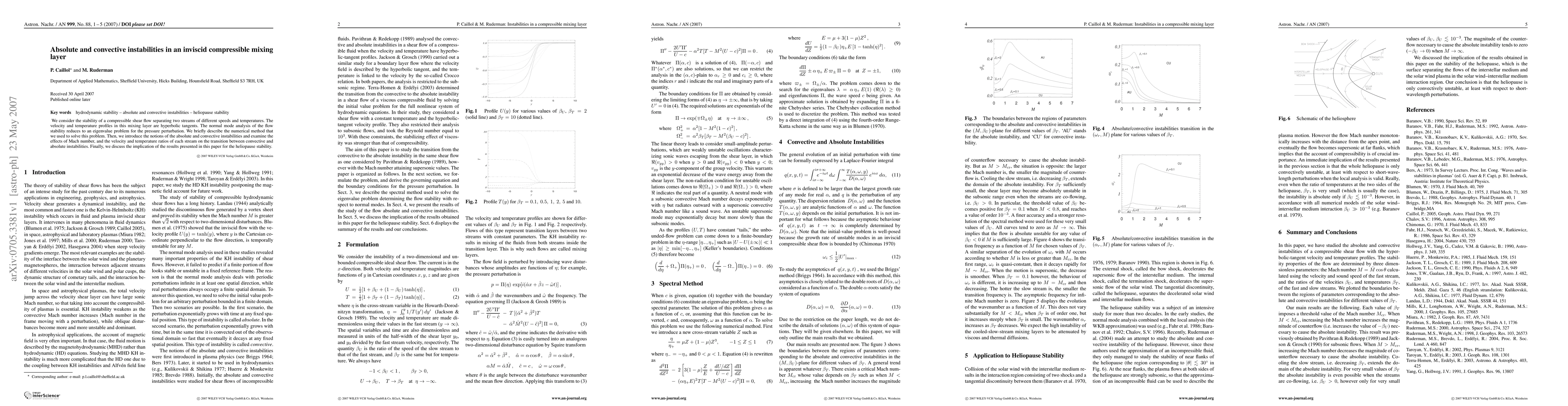 This paper investigates the stability of a compressible shear flow in a mixing layer using normal mode analysis, focusing on the transition between absolute and convective instabilities influenced by Mach number and stream ratios. The findings have implications for understanding the stability of the heliopause.
