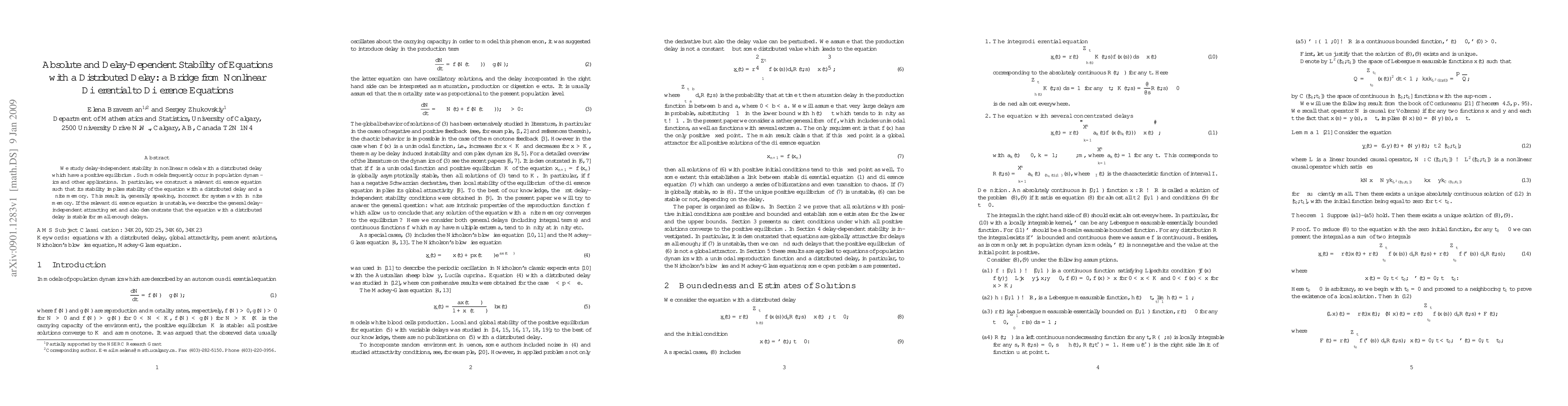 We study delay-independent stability in nonlinear models with a distributed delay which have a positive equilibrium. Such models frequently occur in population dynamics and other applications. In particular, we construct a relevant difference equation such that its stability implies stability of the equation with a distributed delay and a finite memory. This result is, generally speaking, incorrect for systems with infinite memory. If the relevant difference equation is unstable, we describe the general delay-independent attracting set and also demonstrate that the equation with a distributed delay is stable for small enough delays.