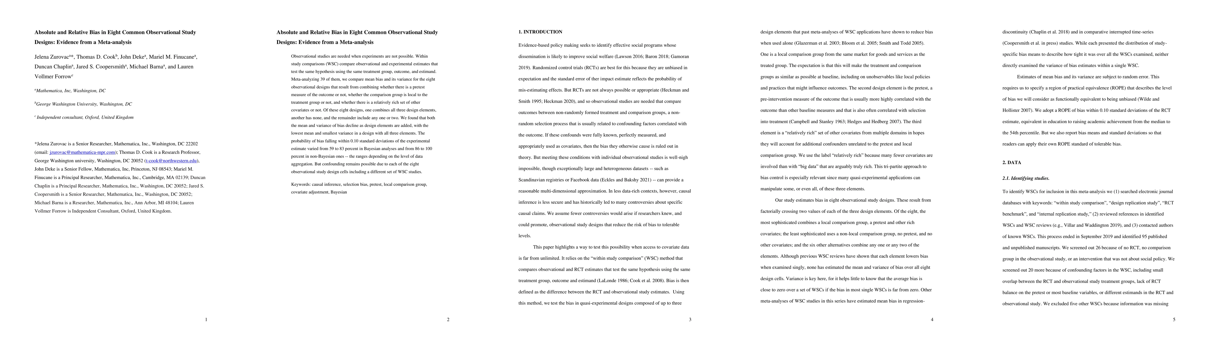 This meta-analysis compares bias in eight common observational study designs, finding that designs incorporating pretest measures, local comparison groups, and rich covariates exhibit lower mean and variance of bias compared to simpler designs. The probability of bias within 0.10 standard deviations of experimental estimates ranges from 59 to 100 percent, depending on the design and analysis method, though confounding remains a concern.