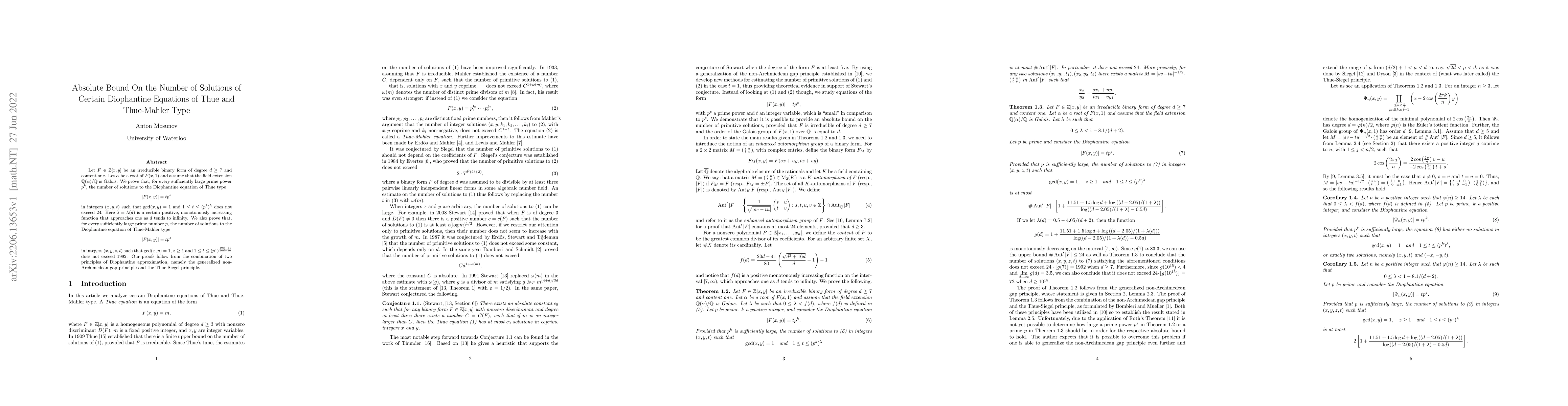 This paper establishes an absolute bound on the number of solutions for certain Diophantine equations of Thue and Thue-Mahler type. It proves that the number of solutions to these equations does not exceed 24 for sufficiently large prime powers and 1992 for sufficiently large prime numbers, using Diophantine approximation principles.