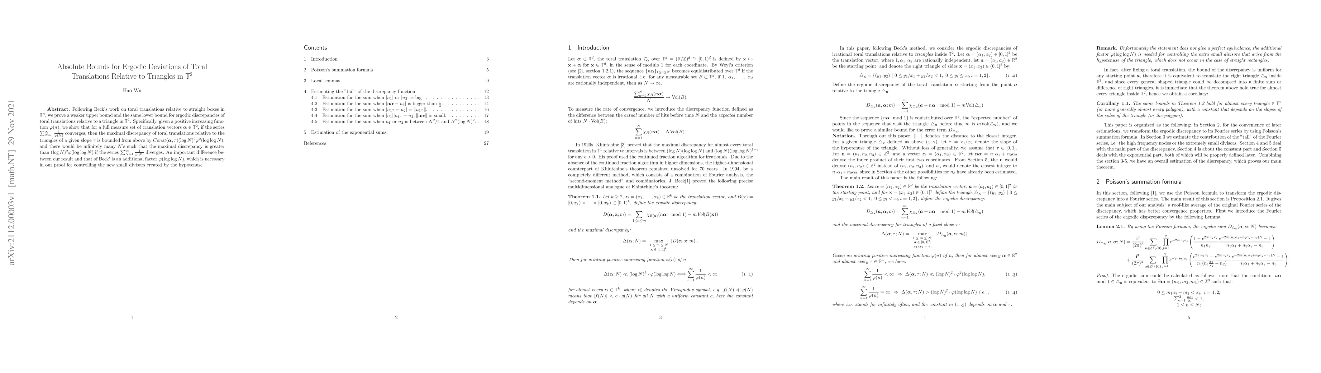 This paper establishes absolute bounds for ergodic deviations of toral translations relative to triangles in $\mathbb{T}^2$, proving a weaker upper bound and the same lower bound for discrepancies compared to Beck's work, with an additional $\varphi(\log \log N)$ factor to control new small divisors from the triangle's hypotenuse.