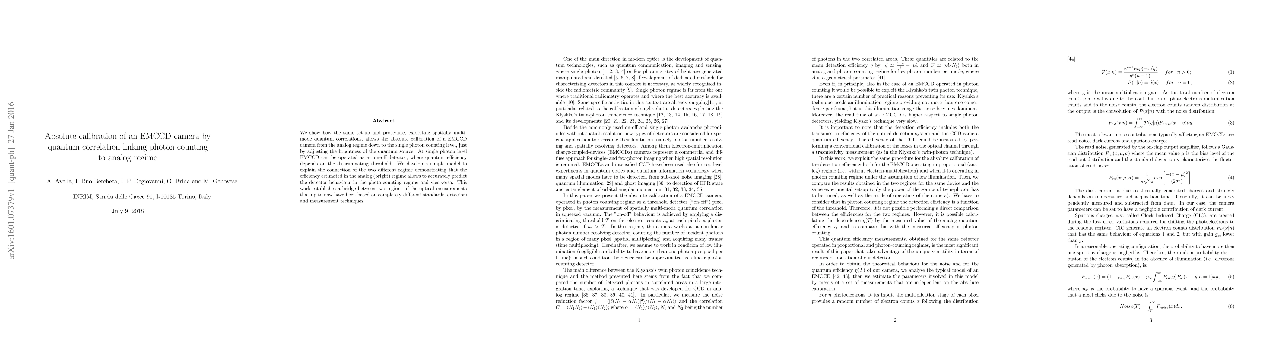 We show how the same set-up and procedure, exploiting spatially multi-mode quantum correlations, allows the absolute calibration of a EMCCD camera from the analog regime down to the single photon counting level, just by adjusting the brightness of the quantum source. At single photon level EMCCD can be operated as an on-off detector, where quantum efficiency depends on the discriminating threshold. We develop a simple model to explain the connection of the two different regime demonstrating that the efficiency estimated in the analog (bright) regime allows to accurately predict the detector behaviour in the photo-counting regime and vice-versa. This work establishes a bridge between two regions of the optical measurements that up to now have been based on completely different standards, detectors and measurement techniques.