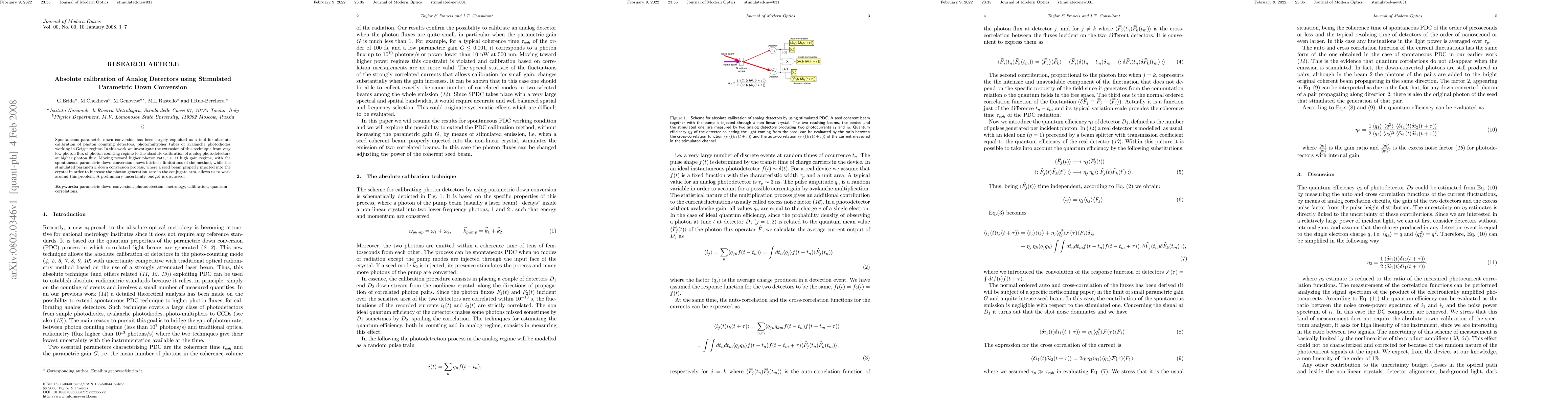 This paper explores the use of stimulated parametric down conversion to calibrate analog photodetectors at higher photon flux, overcoming limitations of the spontaneous method. A preliminary uncertainty budget is presented to assess the technique's effectiveness.