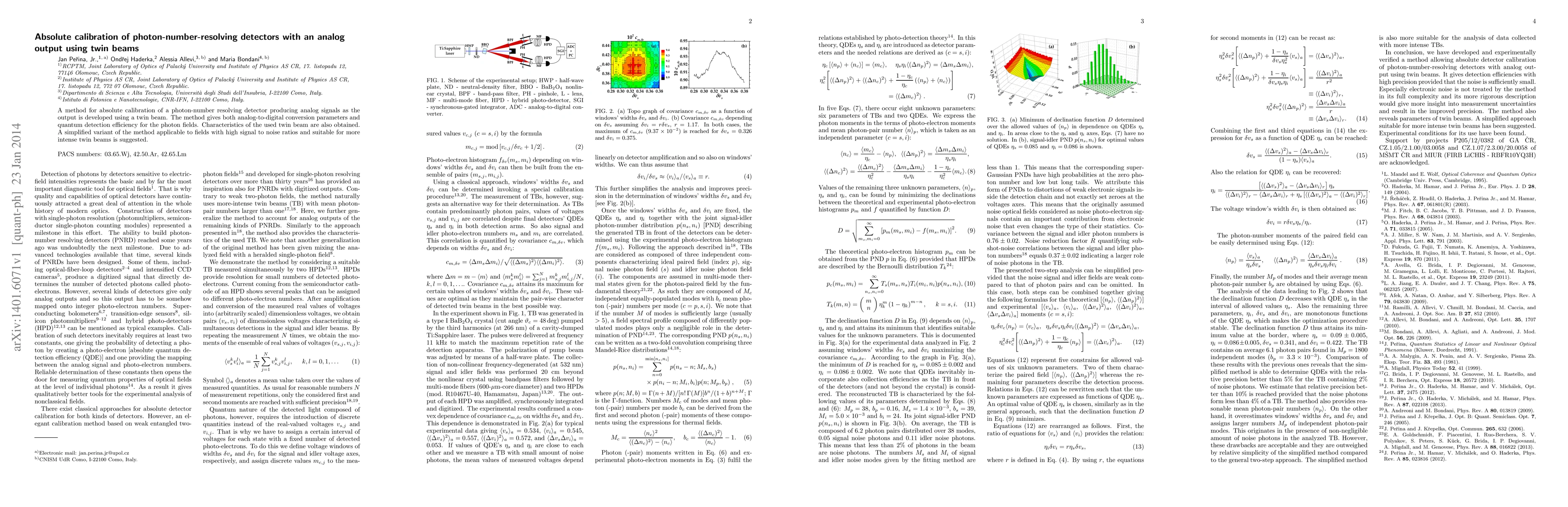 This paper presents a method for calibrating photon-number-resolving detectors with analog outputs using twin beams, providing both conversion parameters and quantum detection efficiency. A simplified version is also proposed for high signal-to-noise ratio fields.