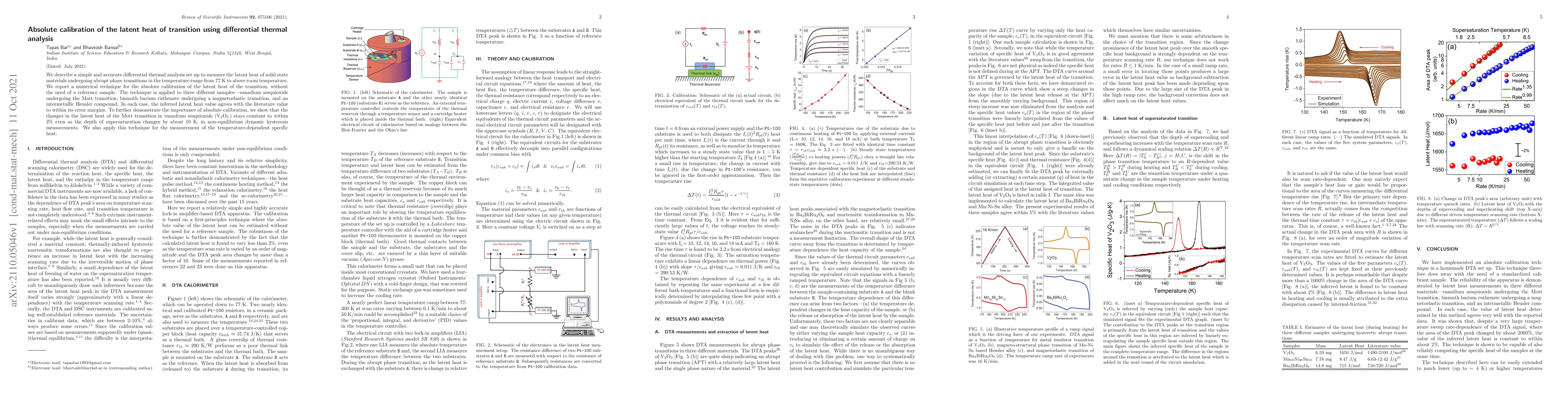 We describe a simple and accurate differential thermal analysis set up to measure the latent heat of solid state materials undergoing abrupt phase transitions in the temperature range from 77 K to above room temperature. We report a numerical technique for the absolute calibration of the latent heat of the transition, without the need of a reference sample. The technique is applied to three different samples -- vanadium sesquioxide undergoing the Mott transition, bismuth barium ruthenate undergoing a magnetoelastic transition, and an intermetallic Heusler compound. In each case, the inferred latent heat value agrees with the literature value to within its error margins. To further demonstrate the importance of absolute calibration, we show that the changes in the latent heat of the Mott transition in vanadium sesquioxide (V$_2$O$_3$) stays constant to within 2% even as the depth of supersaturation changes by about 10 K, in non-equilibrium dynamic hysteresis measurements. We also apply this technique for the measurement of the temperature-dependent specific heat.