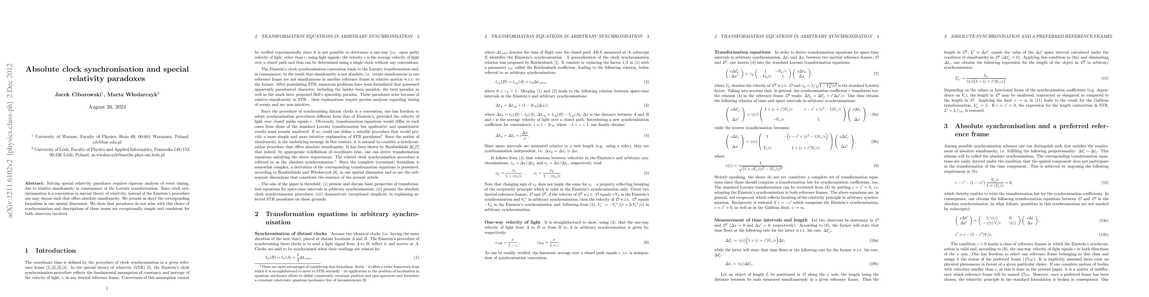 Solving special relativity paradoxes requires rigorous analysis of event timing, due to relative simultaneity in consequence of the Lorentz transformation. Since clock synchronisation is a convention in special theory of relativity, instead of the Einstein's procedure one may choose such that offers absolute simultaneity. We present in short the corresponding formalism in one spatial dimension. We show that paradoxes do not arise with this choice of synchronisation and descriptions of these issues are exceptionally simple and consistent for both observers involved.