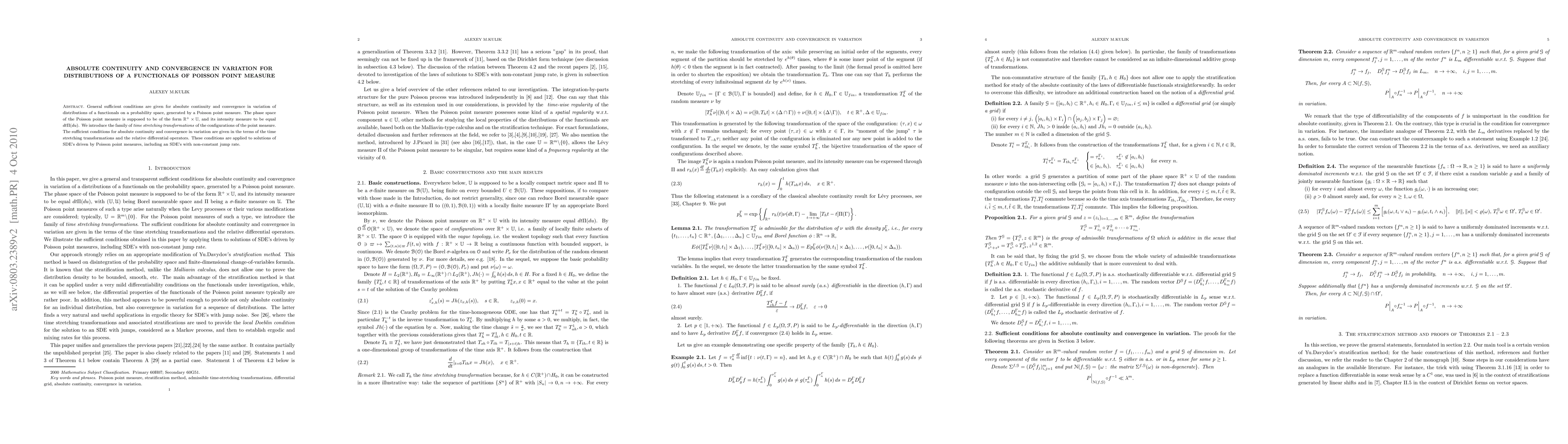 This paper provides sufficient conditions for absolute continuity and convergence in variation of the distributions of functionals generated by a Poisson point measure on a probability space. It introduces time stretching transformations and relative differential operators to derive these conditions, which are applied to solutions of stochastic differential equations driven by Poisson point measures.