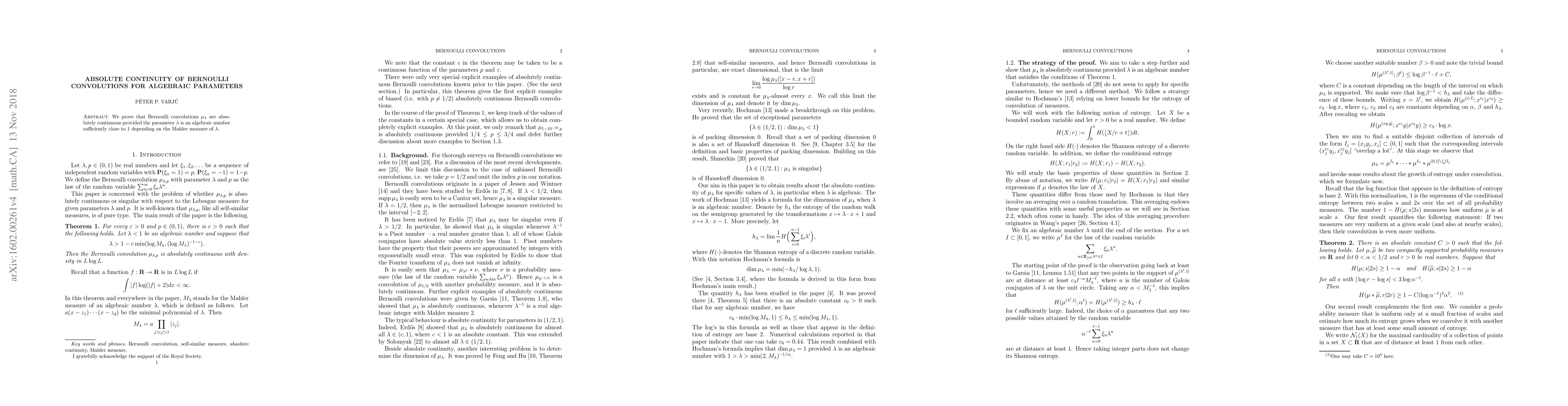 Summary: This paper demonstrates that Bernoulli convolutions exhibit absolute continuity when the parameter lambda is an algebraic number near 1, with the proximity dependent on the Mahler measure of lambda. The result provides new insights into the behavior of these convolutions under specific conditions.