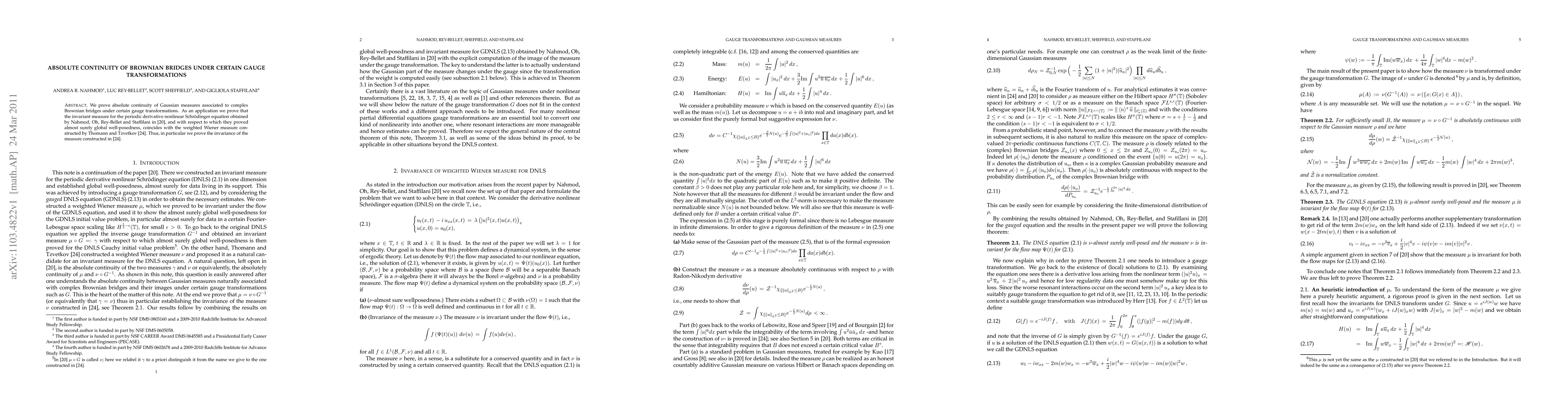 We prove absolute continuity of Gaussian measures associated to complex Brownian bridges under certain gauge transformations. As an application we prove that the invariant measure for the periodic derivative nonlinear Schr\"odinger equation obtained by Nahmod, Oh, Rey-Bellet and Staffilani in [20], and with respect to which they proved almost surely global well-posedness, coincides with the weighted Wiener measure constructed by Thomann and Tzvetkov [24]. Thus, in particular we prove the invariance of the measure constructed in [24].