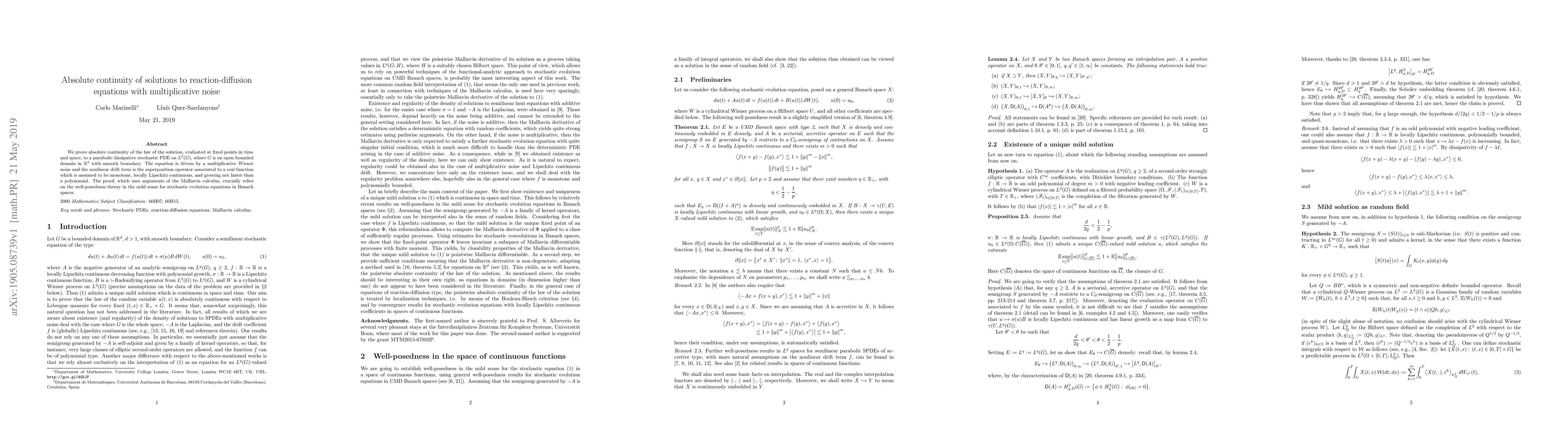 We prove absolute continuity of the law of the solution, evaluated at fixed points in time and space, to a parabolic dissipative stochastic PDE on $L^2(G)$, where $G$ is an open bounded domain in $\mathbb{R}^d$ with smooth boundary. The equation is driven by a multiplicative Wiener noise and the nonlinear drift term is the superposition operator associated to a real function which is assumed to be monotone, locally Lipschitz continuous, and growing not faster than a polynomial. The proof, which uses arguments of the Malliavin calculus, crucially relies on the well-posedness theory in the mild sense for stochastic evolution equations in Banach spaces.
