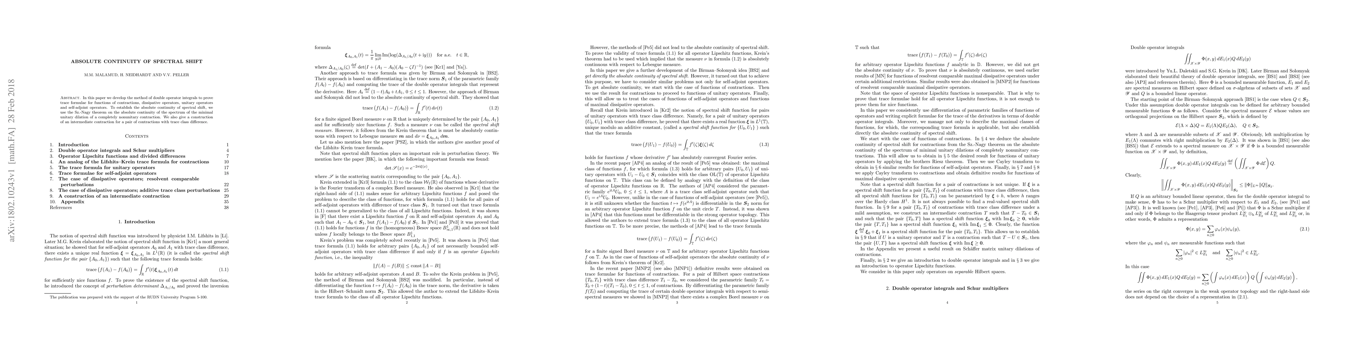 This paper utilizes double operator integrals and the Sz.-Nagy theorem to establish trace formulae for various types of operators and proves the absolute continuity of the spectral shift, along with constructing an intermediate contraction for pairs of contractions with trace class difference.