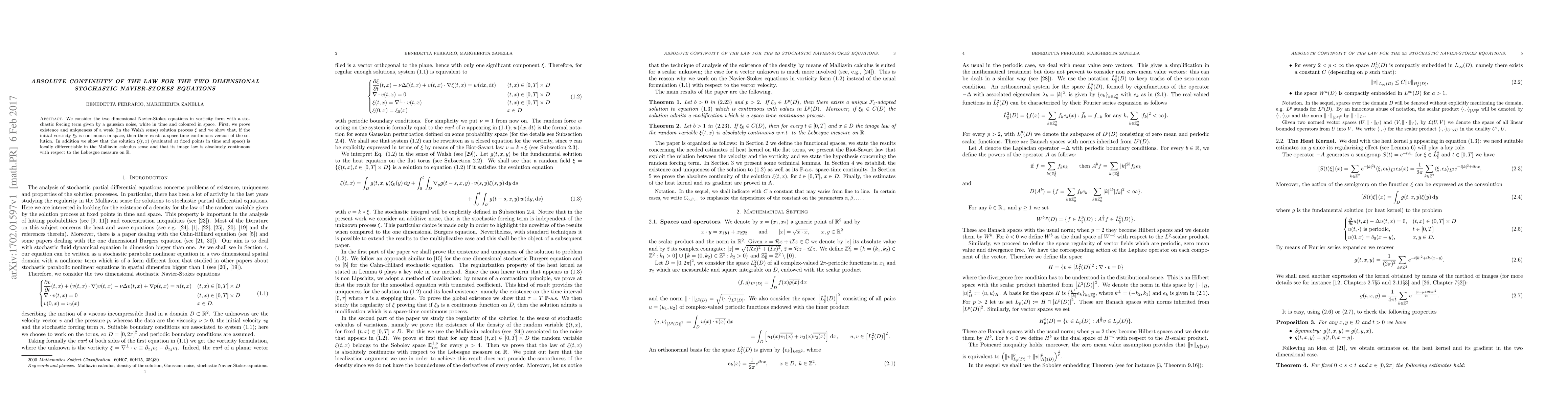 This paper proves the existence and uniqueness of a weak solution to the two-dimensional stochastic Navier-Stokes equations with Gaussian noise. It demonstrates that the solution's law is absolutely continuous with respect to the Lebesgue measure when the initial vorticity is continuous.