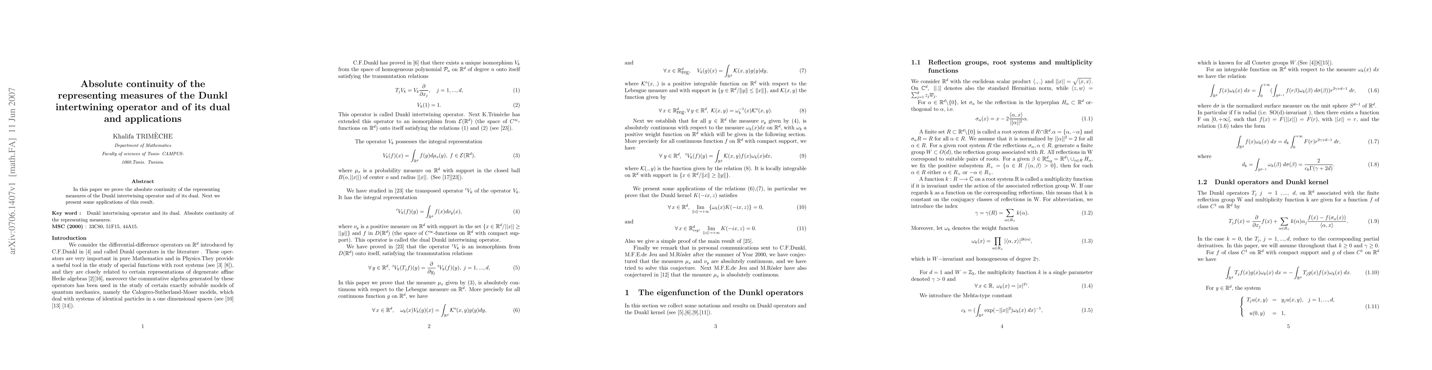 In this paper we consider the representing measures $\mu_{x},x\in \QTR{Bbb}{R}^{d}$, and $\nu_{y},y\in \QTR{Bbb}{R}^{d}$, of the Dunkl intertwining operator and of its dual. When the multiplicity function is positive, we prove that for all $x\in \QTR{Bbb}{R}_{\QTO{mbox}{reg}}^{d}$ we have $d\mu_{x}(y)=\QTR{cal}{K}(x,y)dy$ and for almost all $y\in \QTR{Bbb}{R}^{d}$ we have $d\nu_{y}(x)=\QTR{cal}{K}(x,y)\omega_{k}(x)dx,$ where $\QTR{cal}{K}(x,.)$ is a positive integrable function on $\QTR{Bbb}{R}^{d}$ with support in $\{y\in \QTR{Bbb}{R}^{d}/\Vert y\Vert \leq \Vert x\Vert \}$ and the function $\QTR{cal}{K}(.,y)$ is locally integrable on $\QTR{Bbb}{R}^{d}$ with respect to the measure $\omega_{k}(x)dx$ and with support in $\{x\in \QTR{Bbb}{R}^{d}/\Vert x\Vert \geq \Vert y\Vert \}$. Next we present some applications of this result.