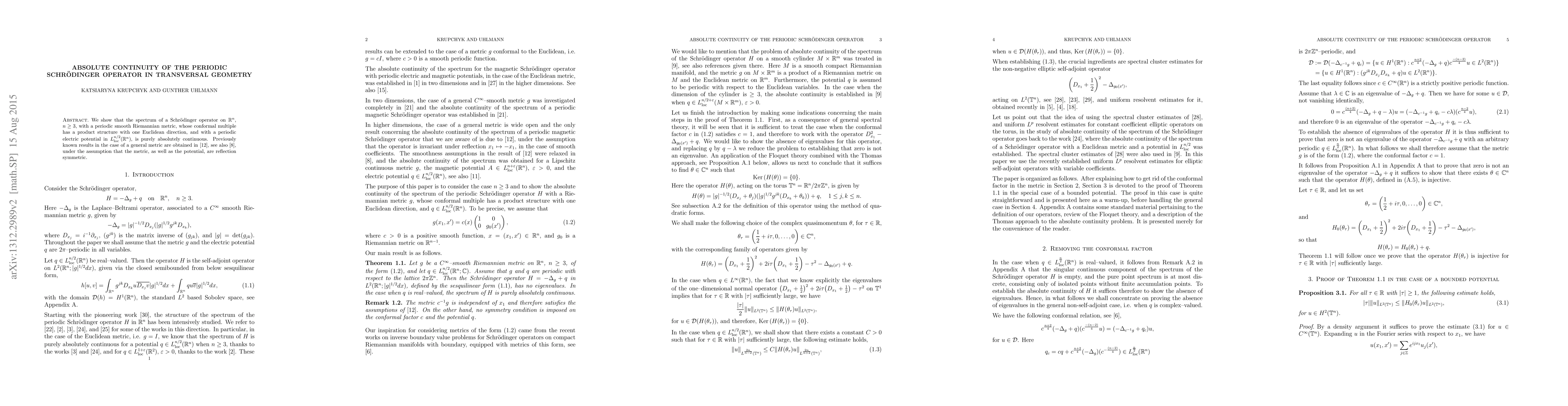 This paper demonstrates that the spectrum of a periodic Schrödinger operator on $\mathbb{R}^n$ with a specific Riemannian metric and potential is purely absolutely continuous. This extends previous results requiring reflection symmetry to a more general setting.
