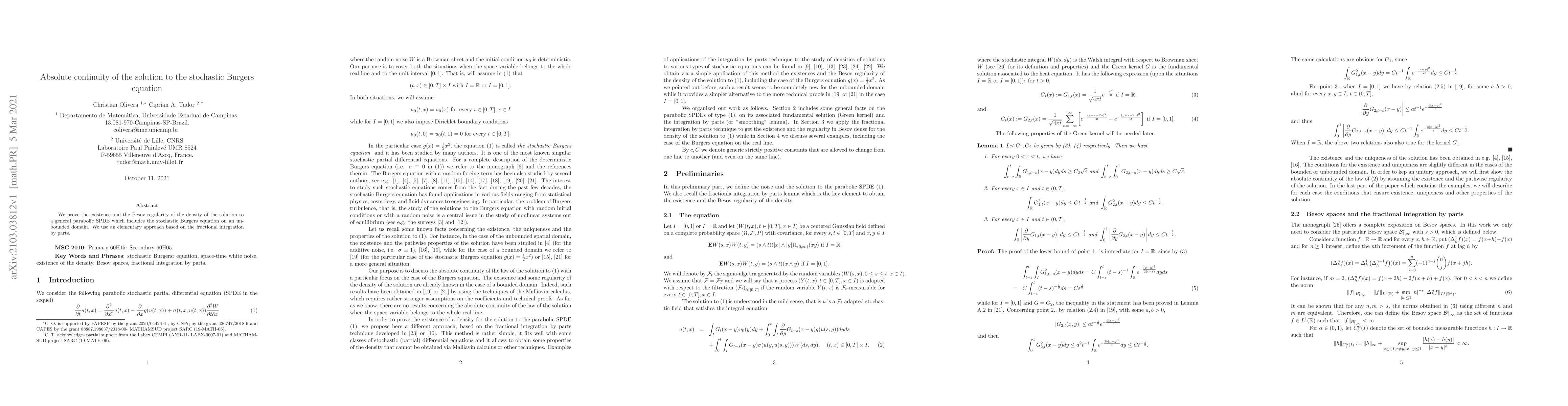 Summary: This paper establishes the existence and Besov regularity of the density for the solution to a general parabolic stochastic partial differential equation, specifically the stochastic Burgers equation, using an elementary fractional integration technique. The approach is applied to an unbounded domain.