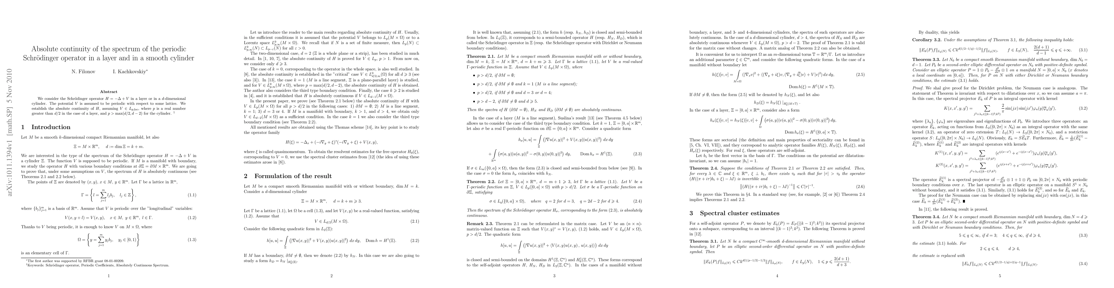 This paper establishes the absolute continuity of the spectrum for the periodic Schrödinger operator $H = -\Delta + V$ in both a layer and a smooth cylinder, with $V$ being periodic with respect to a lattice. The result holds under the condition that $V \in L_{p, \loc}$ with $p > d/2$ for layers and $p > \max(d/2, d-2)$ for cylinders.