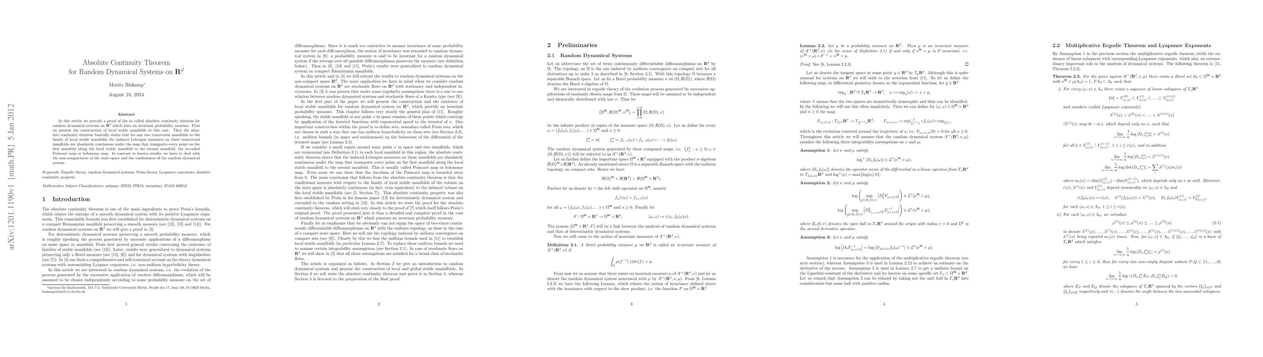 This paper proves the absolute continuity theorem for random dynamical systems on $R^d$ with an invariant probability measure, establishing that Lebesgue measures on transversal manifolds are absolutely continuous under the Poincaré map, despite the non-compactness of the state space and the inherent randomness of the system.